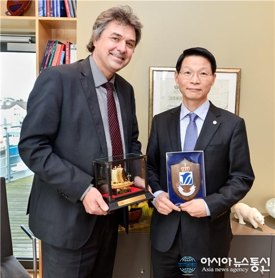 지난 3일 목익수 선박안전기술공단 이사장(오른쪽)이 노르웨이 해사청을 방문해 어선검사, 여객선 안전운항관리 등 주요 해양안전분야 주요 이슈들에 대한 양 기관간 협력방안을 논의하고 Mr. Olav Akselsen 노르웨이 해사청장(왼쪽)과 기념촬..