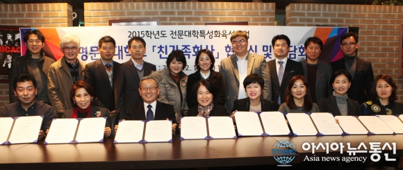 11일 계명문화대학교가 가족회사 중에 특히 대학에 협조적이고 친밀한 가족회사 14개 업체를 선정, 친가족회사 협약을 맺고 기념촬영을 하고 있다.(사진제공=계명문화대학교)