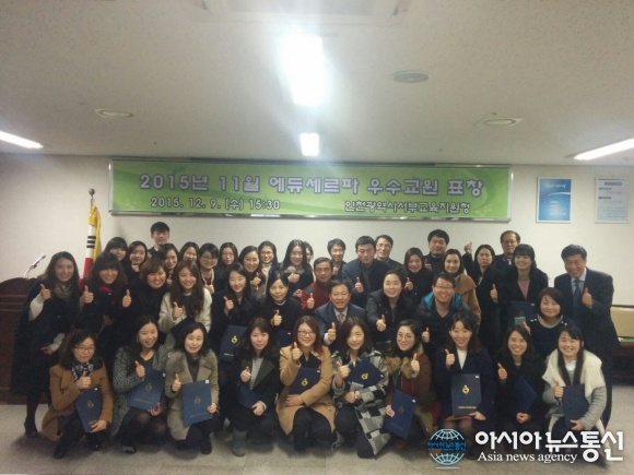 9일 인천서부교육지원청이 에듀 셰르파(Edu-Sherpa) 이달의 우수교원 41명을 표창하고 수상자들과 기념촬영을 하고 있다.(사진제공=인천서부교육지원청)