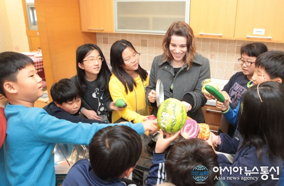 달성군 초등학교 5학년 학생들이 대구경북영어마을에서 4박5일 영어체험 교육을 받고 있다. 사진은 하빈초등학교 학생들이 미국가정체험 중 요리 영어를 배우는 모습.(사진제공=대구경북영어마을)