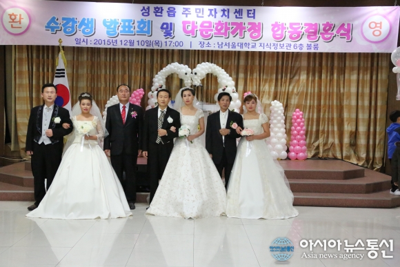 충남 천안시 서북구 성환읍주민자치위원회는 10일 남서울대학교 지식정보관에서 주민자치센터 수강생발표회 및 다문화가정 합동결혼식을 개최했다.(사진제공=천안시청)