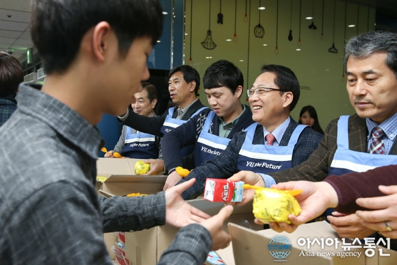 11일 영남대 노석균 총장(오른쪽서 두번째)과 총학생회 학생들이 기말시험 첫 날 아침, 간식을 나눠주고 있다.(사진제공=영남대)