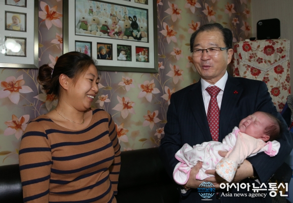 충남 청양군이 넷째 아 출산지원금을 1000만원으로 대폭 인상한 후 첫 번째 아기가 탄생했다.사진은 넷째 아기를 안고 있는 이석화 군수.(사진제공= 청양군청)