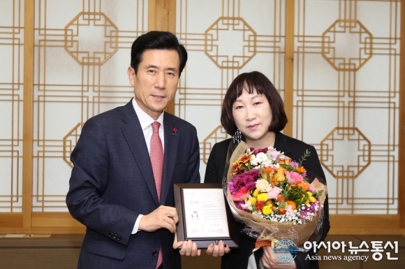 10일 이강덕 경북 포항시장(왼쪽)이 김경숙 소상공인시장진흥공단 대구·경북본부장이에게 감사패를 전달한 후 기념촬영을 하고 있다.(사진제공=포항시청)