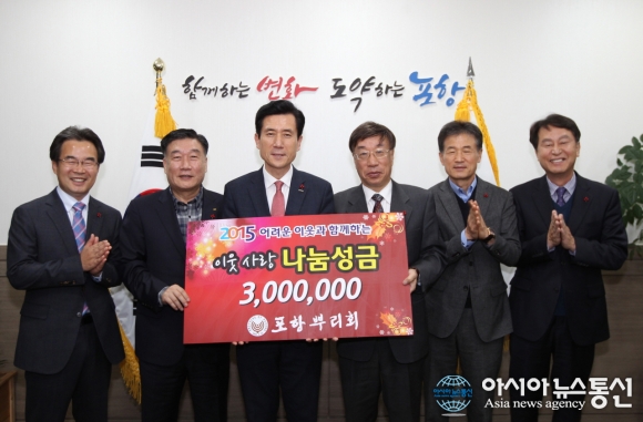 10일 포항뿌리회 금태환 회장과 회원들이 경북 포항시청을 방문해 ‘희망2016 이웃돕기’ 성금 300만원을 기탁하고 있다.(사진제공=포항시청)