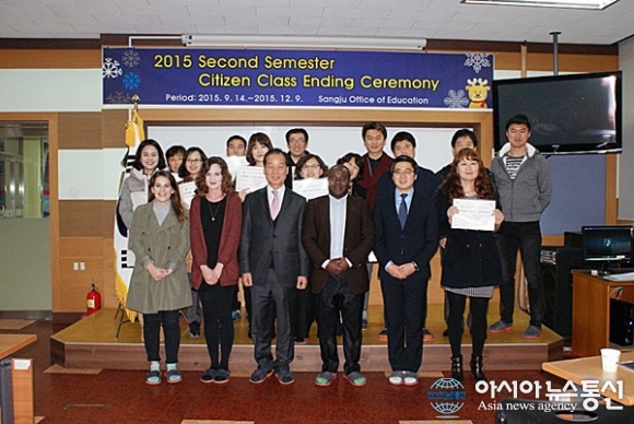 지난 7일 이동걸 상주교육장이 영어체험센터에서 열린 '2015 시민영어회화교실' 종강식에 참석해 우너어민 교사들과 기념사진을 찍고 있다.(사진제공=상주교육지원청)