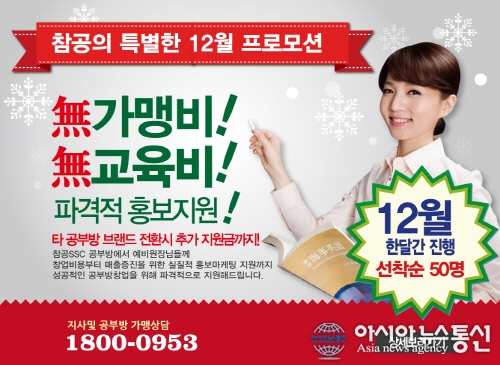 (주)리더스큐브 (대표 전미옥)의 초중고등 전과목 자기주도학습 브랜드 참공SSC는 공부방 창업 희망자들을 대상으로 12월 한 달간 프랜차이즈 창업지원 이벤트를 실시한다.