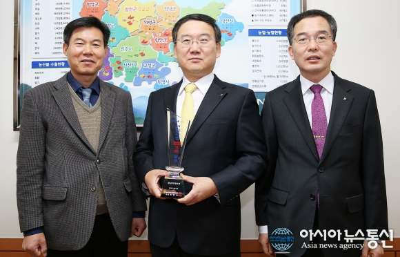 경남농협이 ‘2015 산지유통 1520 프로젝트’ 평가에서 전국 최초로 3000억원 달성탑을 수상한 가운데 김영철 유통사업단장(왼쪽부터)과 김진국 경남농협 본부장, 강우중 경제사업부본부장이 3000억원 달성을 축하하고 있다.(사진제공=..