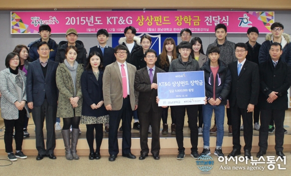지난 10일 경남대학교 한마관 취업전용강의실에서 KT&G 경남본부가 경남대 학생들을 대상으로 ‘KT&G 상상펀드 장학금’ 전달식을 가졌다.(사진제공=경남대)
