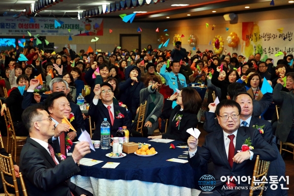 11일 경북 울진관광호텔에서 열린 '2015 울진군 여성대회ㆍ자원봉사자대회'에서 임광원 울진군수를 비롯 장용훈 도의원, 손병복 한울원전본부장 등 기관단체장, 주민들이 여성역량 강화를 기원하는 종이비행기를 날리고 있다.(사..