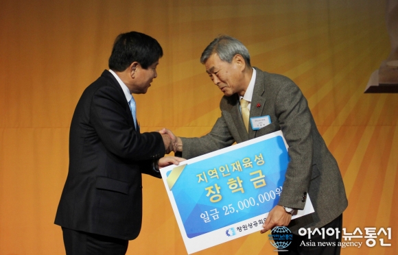 지난 9일 경남 창원 풀만 앰배서더호텔에서 ‘2015 창원상공대상 시상식’이 열린 가운데 최충경 창원상공회의소 회장이 안병학 창원교육지원청 교육장에게 ‘지역인재육성 장학금’ 2500만원을 전달하며 악수를 하고 있다.(..