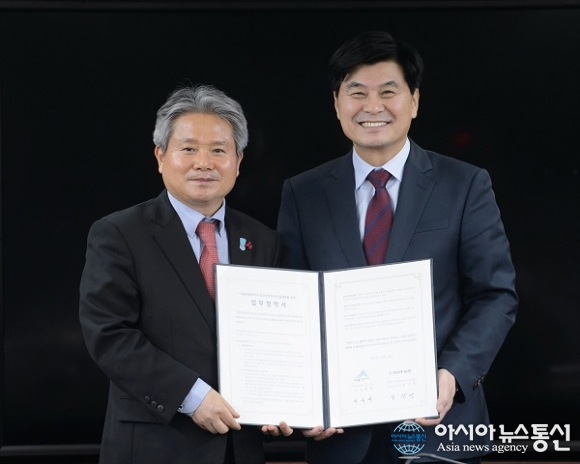 세종시는 KEB 하나은행과 외자유치 활성화를 위한 업무협약을 체결했다. 왼쪽부터 오상영 KEB 하나은행 충청영업그룹대표, 이춘희 세종시장.(사진제공=세종시청)