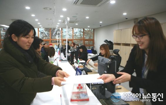 당산2동 공공복합청사를 찾은 민원인(왼쪽)에게 행정서류를 발급해주고 있다.(사진제공=영등포구청)