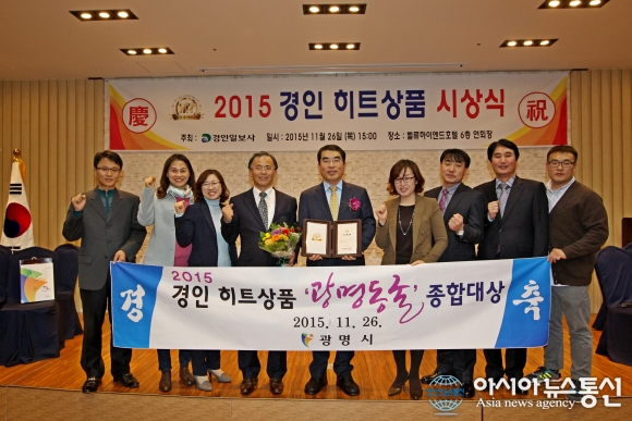 26일 대한민국 최고의 동굴테마파크 ‘광명동굴'이 수원에 위치한 경인일보 신사옥 6층 하이엔드호텔 연회장에서 경인일보가 주최한 ‘2015 경인히트상품’ 영예의 ‘종합대상’을 양기대 광명시장이 수상하고 광명시 ..
