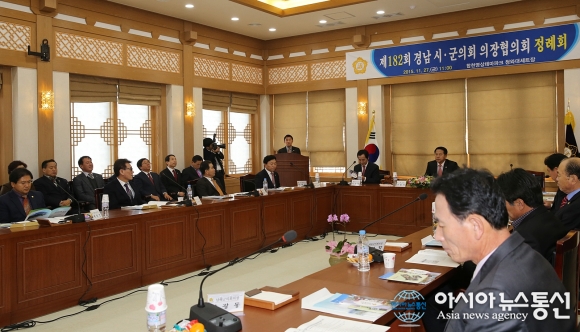 27일 오전 경남시군의회 의장단협의회가 합천군 영상테마파크 내 청와대세트장 회의실에서 '제182회 경남시군의회 의장단협의회'를 열고 있다.(사진제공=합천군청)