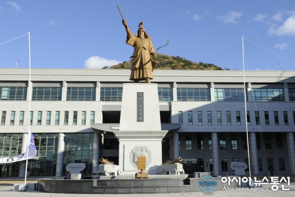 해군은 충무공탄신 470주년과 해군 창설 70주년을 맞아 창원시 진해 해군사관학교 충무광장에 건립한 ‘충무공 이순신 동상' 전경.(사진제공=해군사관학교)