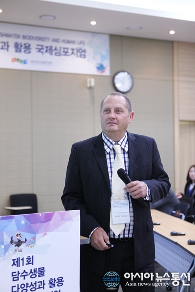 26일 경북 상주시에 소재한 국립낙동강생물자원관이 주최한 국제심포지엄 두 번째 세션 주제발표자 브렛 네일란(뉴사우스웨일즈대학.호주) 교수가 '담수 환경유해생물 제어 및 활용 기술개발'에 대해 발표를 하고 있다.(사진제공=..