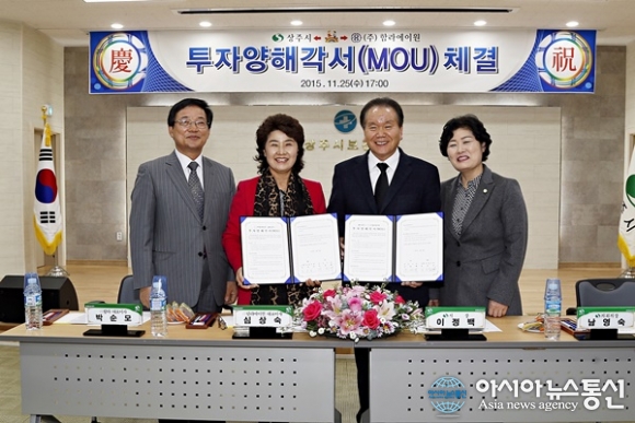 25일 이정백 경북 상주시장. 남영숙 상주시의회 의장.심상숙 주식회사 함라에이원 대표(왼쪽 두번째)는 상주시보건소 3층 대회의실에서 투자양해각서(MOU)를 체결한 후 협약서를 들고 포즈를 취하고 있다.(사진제공=상주시청)