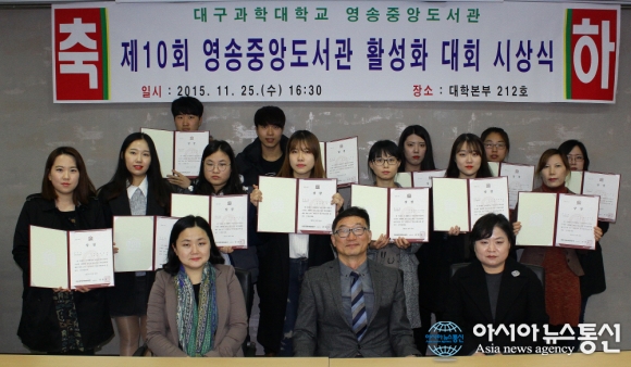 25일 대구과학대학교 대학본부 세미나실에서 진행된 '제10회 영송중앙도서관 활성화대회 시상식'에서 이동성 영송중앙도서관장(1열 왼쪽에서 2번째)을 비롯한 지도교수들과 수상자들이 단체 기념촬영을 하고 있다.(사진제공=대구..