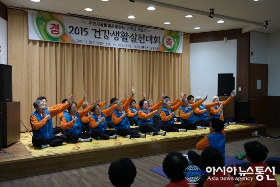 25일 충북 영동군은 영동군보건소 대회의실에서‘주민 스스로 매일 운동하는 경로당 만들기’건강생활실천대회를 열었다. 사진은 영동읍 영산리 실내체조팀 시연 장면.(사진제공=영동군청)