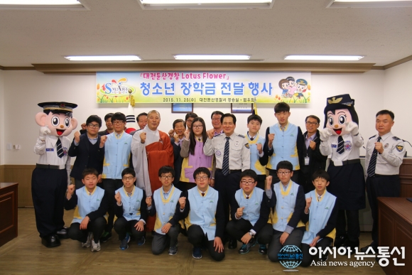 25일 대전둔산경찰서는 '대전충남 파라미타 청소년협회'에서 선발한 학생 13명에게 장학금 200만원을 전달했다.(사진제공=대전둔산경찰서)