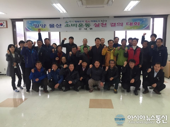 경남 밀양시 가곡동(동장 최병식)과 산내면(면장 이제승)은 25일 '밀양물산 소비운동 실천 결의대회'를 했다.