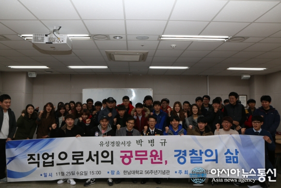 25일 박병규 대전유성경찰서 서장은 한남대학교 56주년 기념관 강의실에서 '직업으로서의 경찰'이라는 주제로 특강을 실시했다.(사진제공=유성경찰서)