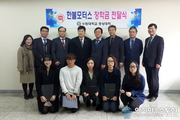한불모터스(주)는 지난 24일 수원대학교 학생 5명에게 총 500만원의 장학금을 교내 경상대 학장실에서 전달했다.