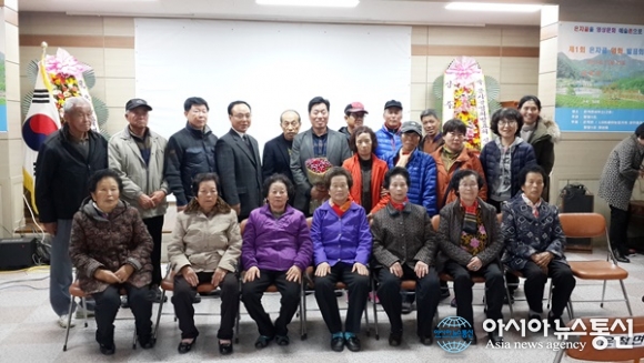 25일 오후 농촌드라마 제작발표회를 가진 경북 상주 은척면 황령1리 마을주민들이 영화 상영 후 기념사진을 찍고 있다. 꽃을 든 이가 박동일 감독이다.(사진제공=상주시청)