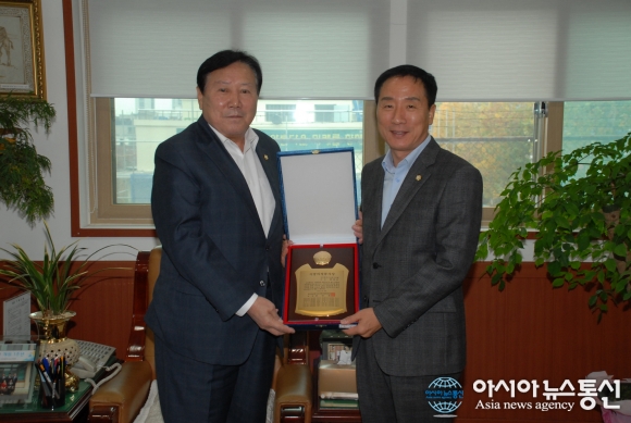 지난 19일 인천남동구의회 한민수 의장(오른쪽)이 인천시군구의장협의회 월례회의 자리에서 지방자치 발전에 기여한 공로로 전국시군자치구의회의장협의회로부터 지방의정봉사상을 수상하고 있다.(사진제공=인천남동구의회)