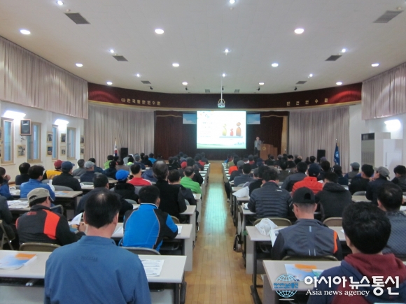 지난 20일 인천항만연수원에서 진행된 인천항 일용직 하역근로자 안전교육 참가자들이 연수원 교수진의 강의에 귀를 기울이고 있다.(사진제공=인천항만공사)