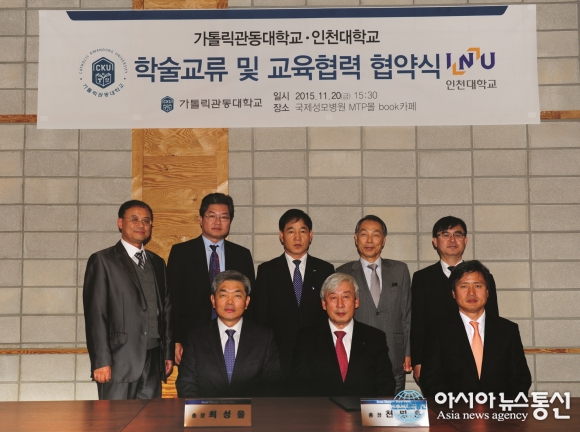 지난 20일 인천대학교와 가톨릭관동대학교는 가톨릭관동대학교 부속병원 국제성모병원에서 양 대학 간 상호협력 및 공동발전 모색을 위한 학술교류 MOU를 체결하고 기념촬영을 하고 있다.(사진제공=인천대학교)