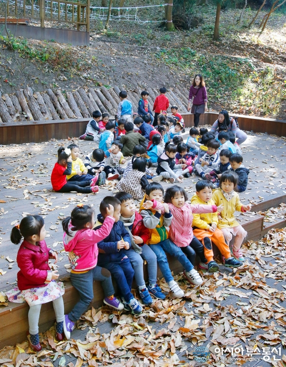 지난 10월말부터 광주시 동구가 시범운영중인 화순군-광주 동구 간 옛 도로 너릿재 인근 유아숲공원서 이곳을 찿은 에델바이스어린이집 원생들이 늦가을의 정취를 만끽하며 즐거운 시간을 갖고 있다.(사진제공=광주시 동구청)