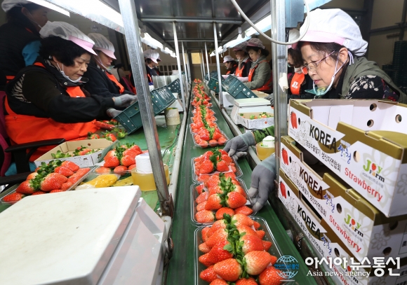 수출길에 오르는 경남 산청딸기 포장 모습.(사진제공=산청군청)