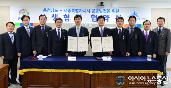23일 충남도청 상황실에서 충남도와 세종특별자치시 공동 발전을 위한 상생협력 협약을 체결한 안희정 지사와 이춘희 세종시장(왼쪽 5·6번째)이 기념촬영을 하고 있다.(사진제공=충남도청)