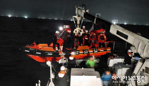 20일 오전 1시47분쯤 경북 포항해경 요원들이 조업 중 선박 균형 상실로 침몰하면서 구명보트에 승선한 채 표류하다 인근 해상서 조업 중이던 동해구 트롤 P호에 의해 긴급 구조된 침몰어선 S호 승선원들을 경비함정에 편승하고 있다. 이들..
