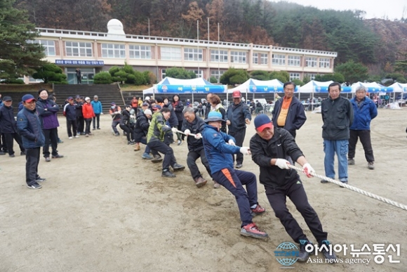 19일 열린 김천 대덕면 '면민한마음화합대회'에서 면민들이 팀을 나눠 줄다리기를 하고 있다.(사진제공=김천시청)