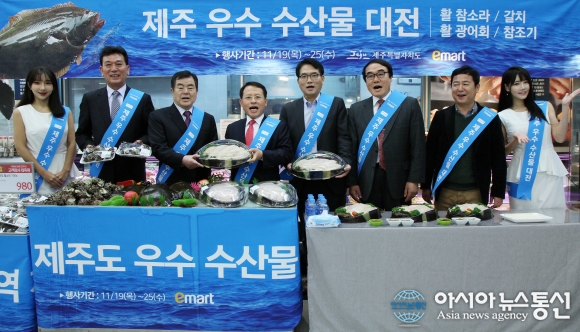 20일 서울 성동구 이마트 성수점에서 제주 우수 수산물 대전이 열린 가운데 참석 내빈들이 제주도 특산물 판촉행사에 나서고 있다. (좌측부터) 양영철 서귀포수협 상임이사, 양용웅 제주어류양식수협 조합장, 권영수 제주부도지사, 최성..