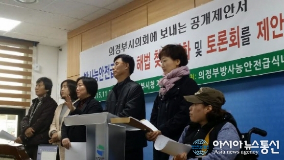 20일 오전 경기도 의정부시청 기자실에서 의정부방사능안전급식네트워크가 기자회견을 열고 방사능안전급식조례 해법을 찾기 위한 대화 및 토론회를 의정부시의회에 제안하고 있다.(사진제공=방사능안전급식네트워크)