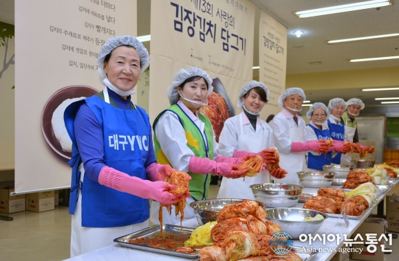 20일 대백프라자점 12층 직원식당에서 구정모 대표이사 외 대구백화점 임원들과 팀장급 이상 간부직원들, 중구 자원봉사센터, 대구YWCA 자원봉사자가 참여한 가운데 '제13회 사랑의 김장 나눔 축제' 행사가 열리고 있다.(사진제공=대..