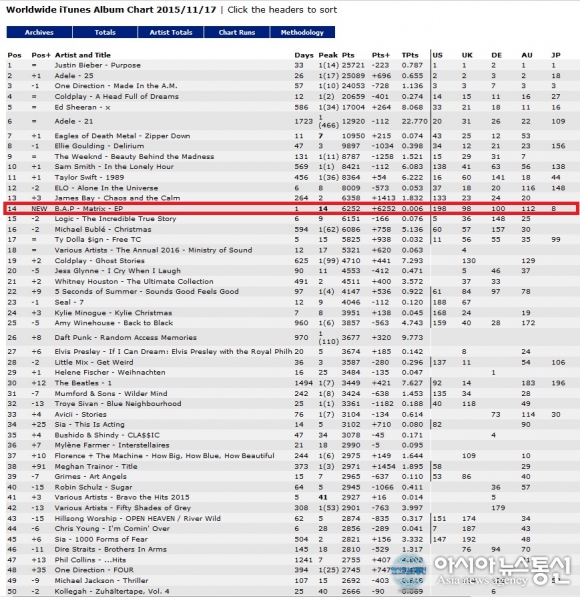 B.A.P의 네 번째 미니앨범 ‘MATRIX’가 발매 하루만인 지난 17일자 ‘Worldwide iTunes Album Chart(월드와이드 아이튠즈 앨범차트)’에 14위로 진입했다.