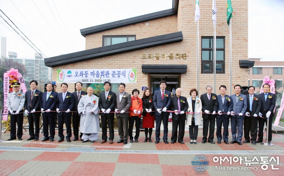 20일 경기 평택시 송북동주민센터는 오좌동(독곡동 294-6 송북동 10통)마을회관 준공식을 개최했다.사진은 준공 테이프를 절단하고 있는 모습.(사진제공=평택시청)