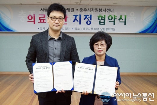20일 충북 충주시청 남한강회의실에서 충주시자원봉사센터와 서울더블유치과병원이 의료기관 지정협약 체결한 가운데 이옥순 충주시자원봉사센터장(오른쪽)과 김형석 서울더블유치과병원 이사장(왼쪽)이 기념촬영을 하고 있다.(사진제..