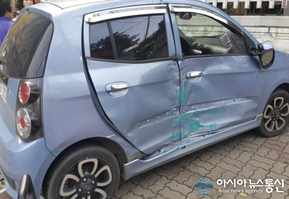 20일 오후 경남 통영시 무전동 한 사거리에서 버스와 추돌한 후 인도에 멈춰선 모닝승용차./아시아뉴스통신=양성옥 기자