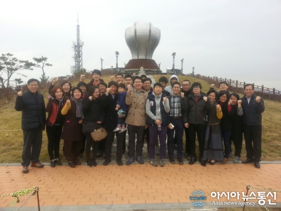 광양시에 근무하고 있는 공중보건의사와 가족들이 구봉산 전망대에서 기념촬영을 하고 있다.(사진제공=광양시청)