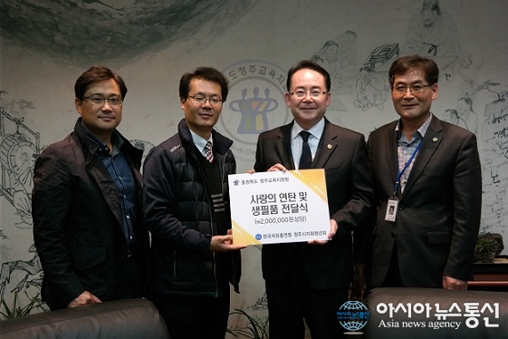 20일 충북 청주교육지원청(교육장 최완규.왼쪽 세번째)과 한국자유총연맹 청주시지회청년회(회장 이창우.왼쪽 두번째)는 청주교육지원청에서‘사랑의 연탄 및 생필품 전달식’을 가졌다.(사진제공=청주교육지원청)