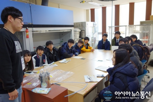 20일 금오공대가 마련한 전공체험 프로그램에 참여한 고교 1.2학년생들이 금오공대생으로부터 설명을 듣고 있다.(사진제공=금오공대)