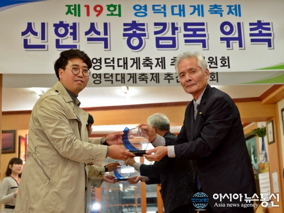 지난 11일 이춘국 영덕대게축제추진위원장(오른쪽)이 신현식 겸임교수(관광학 상지대)를 영덕대게축제 총감독으로 재위촉하고 있다.(사진제공=영덕군청)