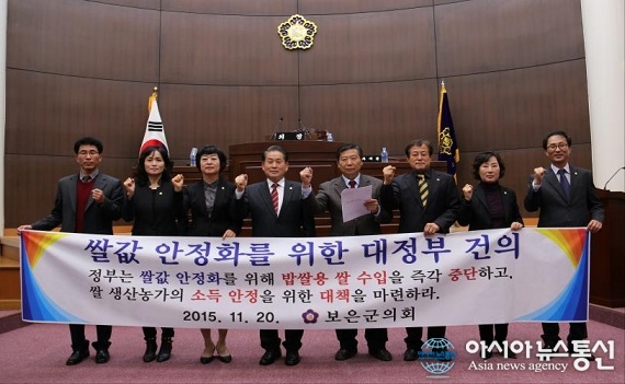 20일 충북 보은군의회(의장 박범출.왼쪽 네번째)가 ‘쌀값 안정화를 위한 대정부 건의문’을 채택하고 밥쌀용 쌀 수입을 즉각 중단할 것 등을 촉구했다.(사진제공=보은군의회)