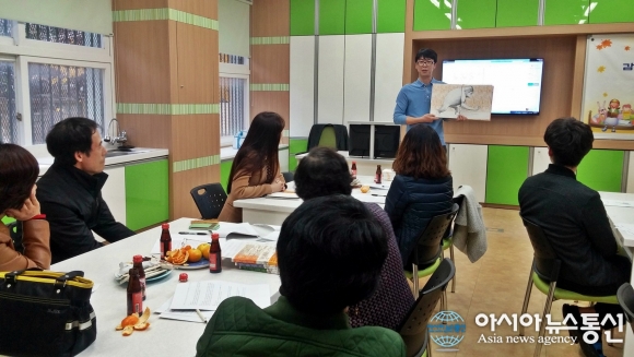 지난 18일 경북 영덕 축산항초등학교 교사들이 독서교육 및 책 읽어주기 연수를 갖고 있다.(사진제공=축산항초등학교)